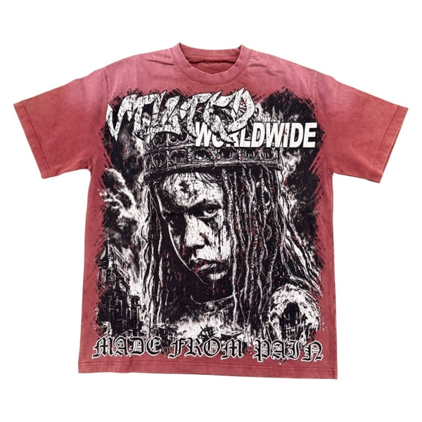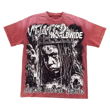 The Damage Tee features a washed red base layered with distressed, high-contrast artwork that captures struggle, pressure, and resilience. Gritty textures meet bold tour-inspired typography, creating a piece that feels lived-in and unapologetic.