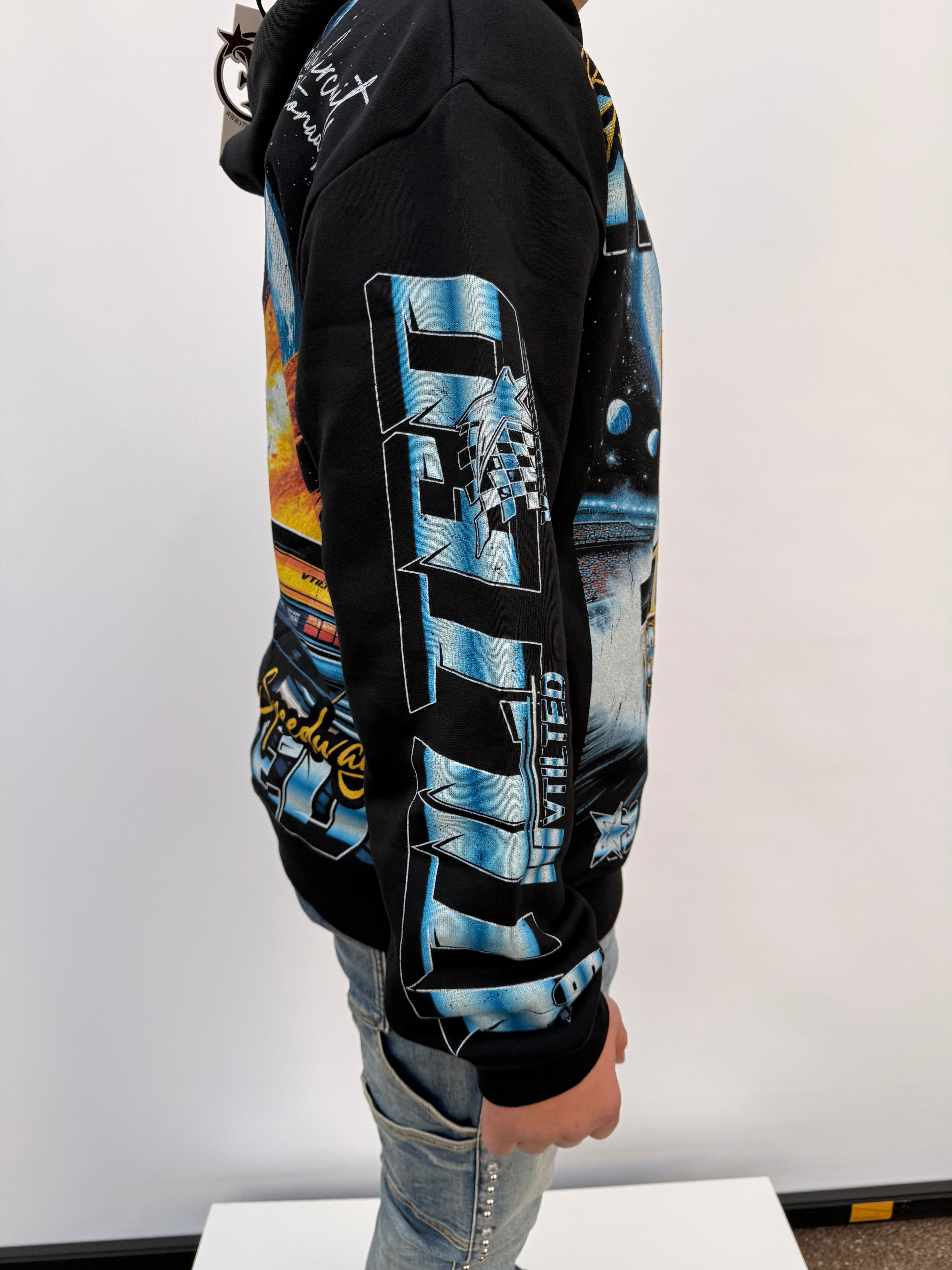 Care: Wash cold with like colors, hang to dry, avoid ironing over graphic
